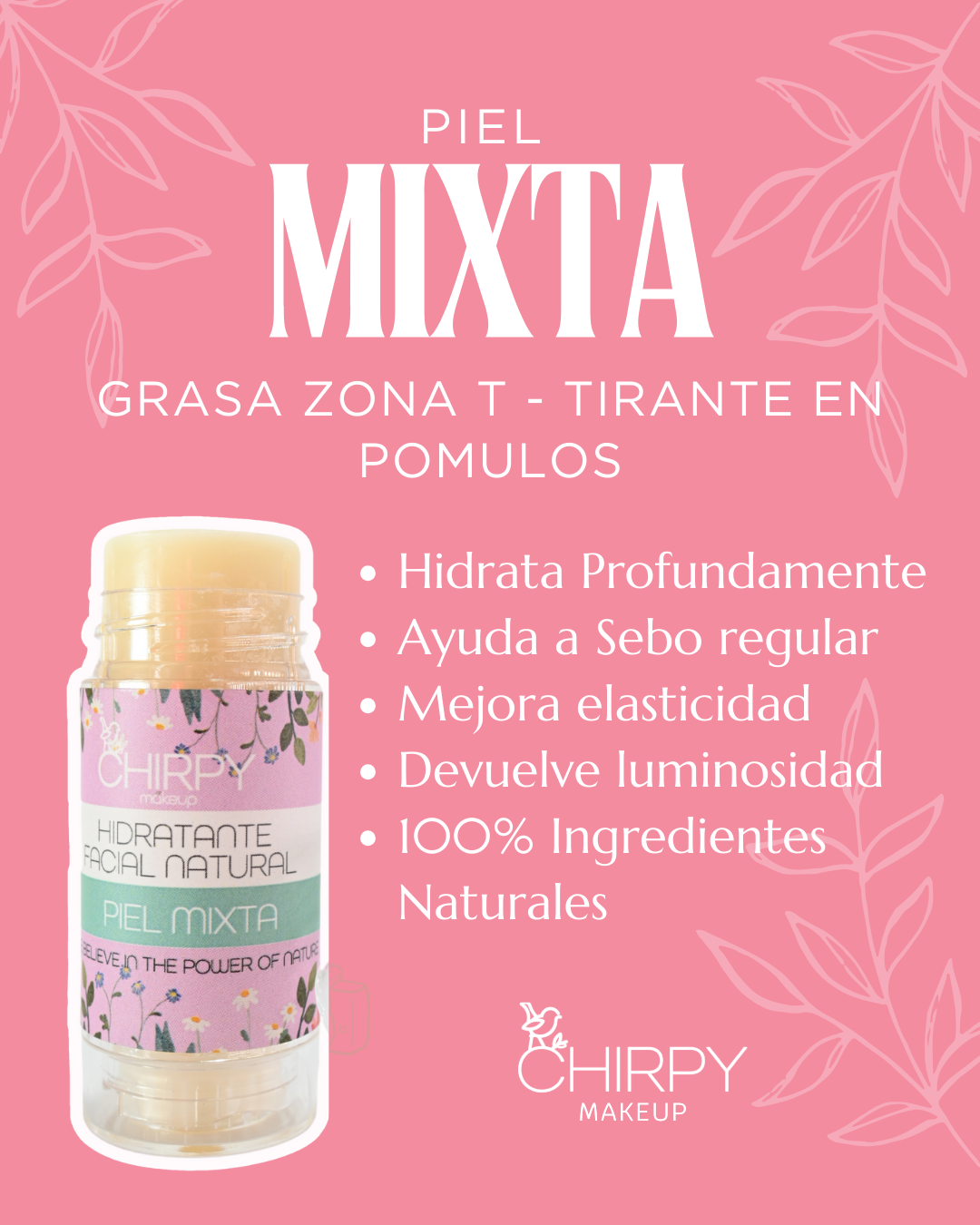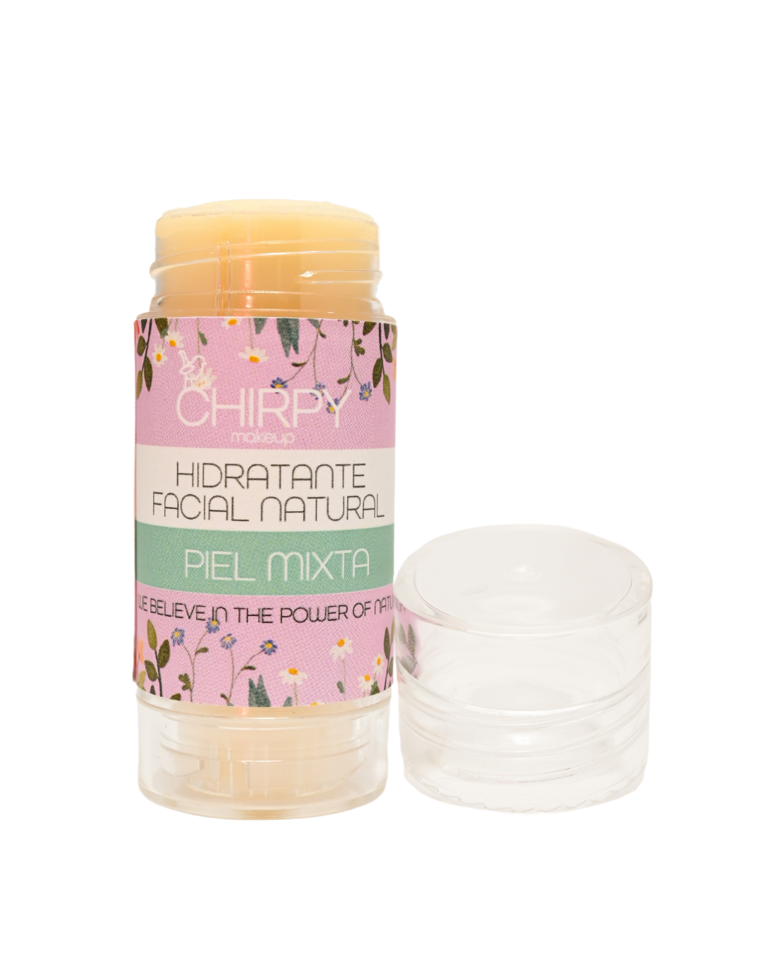 El Hidratante Chirpy makeup para piel Mixta formulado con aceites vegetales de almendras dulces, jojoba y pepita de uva, con velocidad media de absorción ideales para equilibrar este tipo de piel, los aceites vegetales tienen una absorción del 70% mucho más que otros ingredientes faciales, aceites esenciales de romero y ciprés, con sus propiedades antioxidantes, antiinflamatorias, estimulan la circulación y ayudan a sebo regular la piel. Ceras vegetales que aportan emoliencia a la piel y como ingrediente activo el extracto de semillas de maracuyá que aporta hidratación ayuda a la regeneración celular y al ser rico en ácidos grasos nutre y ayuda a mantener la barrera cutanea.