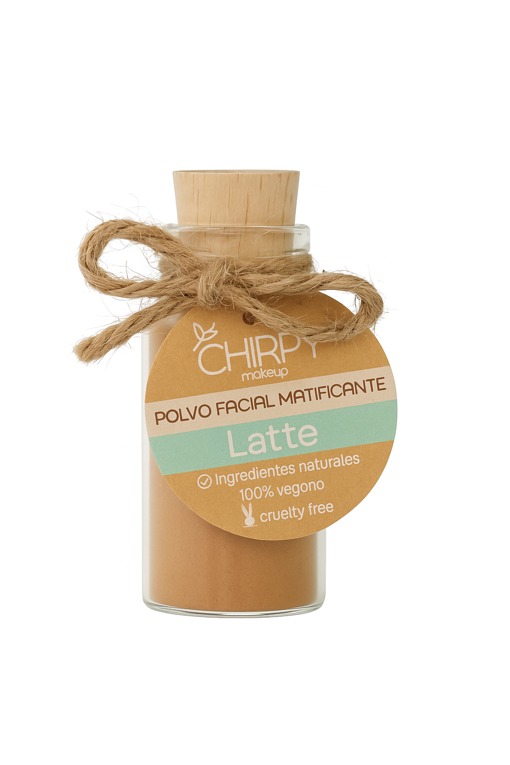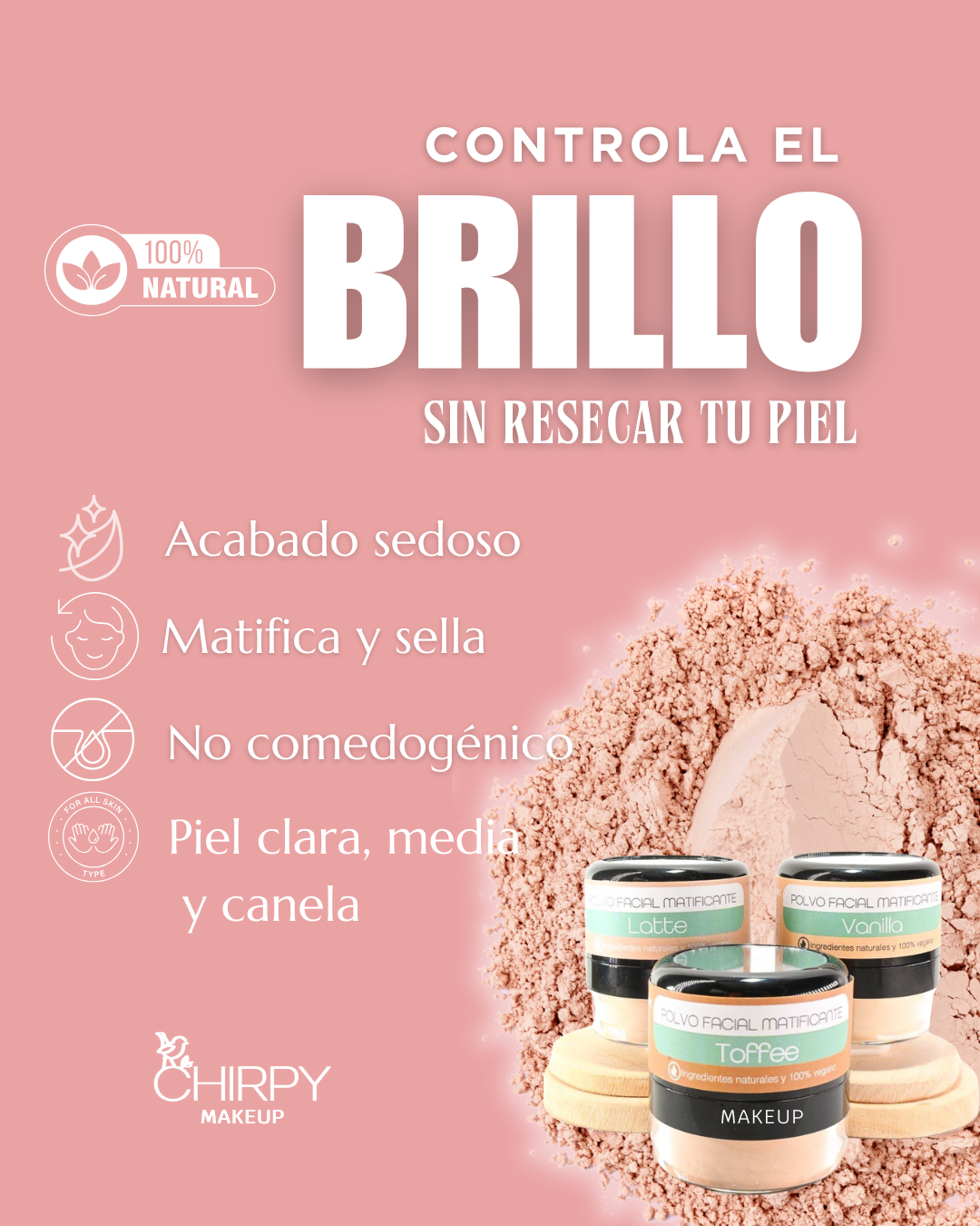 "Recarga Polvo matificante Chirpy Makeup — base en polvo que matifica, sella y suaviza con acabado natural. Con arroz, arcilla y pigmentos minerales que controlan el brillo y unifican el tono. Tono: Medio."